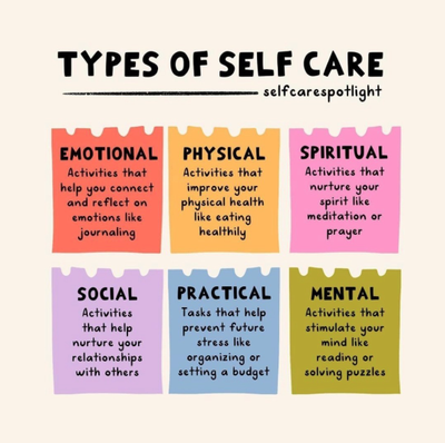 Self‑Care: It is easy to neglect self-care as workloads increase and schedules become full, but it is important to integrate as a regular practice in everyday life. Self-care practices can take many forms, including physical, social, emotional, or mental.